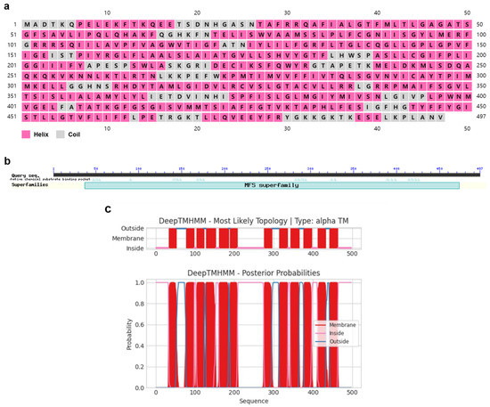 PxTret1-like had an open reading frame (ORF) with 1491 base pairs that encoded for 497 amino acids (aa). The PxTret1-like structure consisted of three exons and two introns, and the gene contained one highly conserved domain. PxTret1-like was found to be a hydrophobic protein with an isoelectric point of 9.45 and theoretical molecular weight of 54,884.81. The PxTret1-like secondary structure prediction suggested a helix and curl structure, and the transmembrane domain contained 12 transmembrane domains (Figure 1).