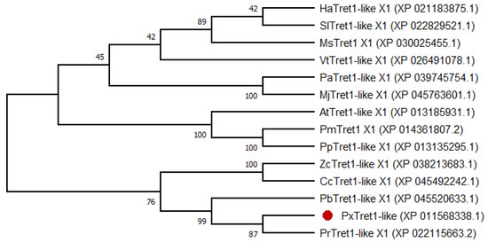 The cDNA sequences of PxTret1-like were compared with the Tret1 cDNA sequences of other insects in GenBank using the Blast tool on the NCBI website, and those of P. xylostella were constructed using maximum likelihood analysis with 1000 replicates in MEGA X.