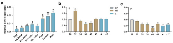 The expression patterns of PxTret1-like in Plutella xylostella. (a) Expression development patterns of PxTret1-like; (b) expression of PxTret1-like in female adults treated at different temperatures (32 °C, 35 °C, 38 °C, 40 °C, 43 °C, 4 °C, −17 °C); (c) expression of PxTret1-like in male adults treated at different temperatures (32 °C, 35 °C, 38 °C, 40 °C, 43 °C, 4 °C, −17 °C). The Student–Newman–Keuls test was used to analyze the expression of Pxtret1-like at different developmental stages. The independent-samples t-test was used to analyze the expression of PxTret1-like in female and male adults subjected to stress at different temperatures. Error bars represent standard error of the mean. Different letters indicate significant differences in expression levels. * indicates p < 0.05; ** indicates p < 0.01; *** indicates p < 0.001.