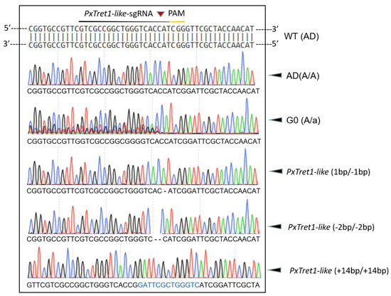 The target site was designed in exon 3 of PxTret1-like based on the principle of CC(19 N)CC or GG(19 N)GG (Table 3), and the potential off-target effect of sgRNA was determined using the Cas-OFFinder design tool (http://www.rgenome.net/cas-offinder (accessed on 8 May 2021)).