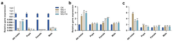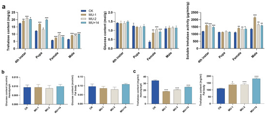 Effects of Pxtret1-like knockout on the expression of TPS and TRE in Plutella xylostella at different developmental stages. (a) The expression of TPS; (b) the expression of TRE1-1; (c) the expression of TRE1-2. CK: wild-type strain; MU-1: PxTret1-like-1 bp mutant; MU-2: PxTret1-like-2 bp mutant; MU+14: PxTret1-like+14 bp mutant. Error bars represent standard error of the mean. An ndependent-samples t-test was used. * indicates p < 0.05; ** indicates p < 0.01; *** indicates p < 0.001.