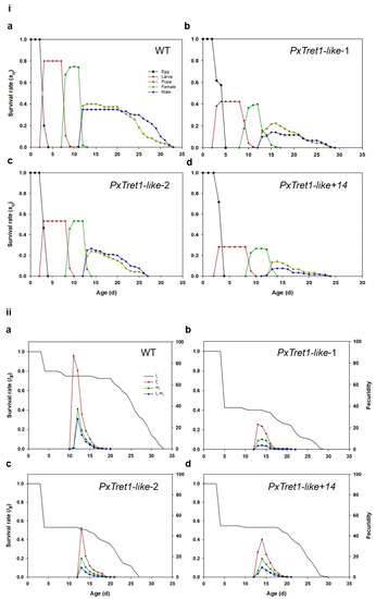 Effects of PxTret1-like knockout on age-stage characteristics of Plutella xylostella. (i) Age-stage survival rates (Sxj) of Plutella xylostella in different strains and in different generations; (ii) age-specific survival rates (lx), female age-stage specific fecundity (fxj) and age-specific fecundity of total population (mx) of Plutella xylostella in different strains and in different generations. (a): wild-type strain; (b–d): mutant of PxTret1-like.