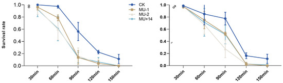 With the extension of the treatment time at 42 °C, the survival rate of male and female adults of the mutant strain was lower than that of the wild-type strain (Figure 8).