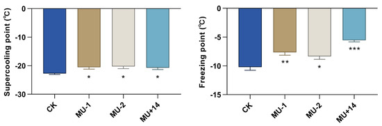 We found that the supercooling points of mutant pupae (MU-1, MU-2, MU+14; −20.91 ± 0.69 °C, −20.26 ± 0.78 °C, −20.69 ± 0.65 °C) were significantly higher than those of the wild-type strain (−22.74 ± 0.33 °C). The freezing points of mutant pupae (MU-1, MU-2, MU+14; −7.65 ± 0.50 °C, −8.35 ± 0.52 °C, −5.55 ± 0.28 °C) were significantly higher than those of the wild-type strain (−10.21 ± 0.56 °C) (Figure 9).