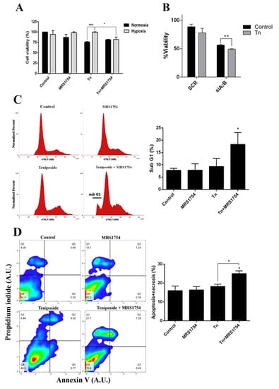 Since the blockage of A2B adenosine receptor prevents MRP3 induction and the extrusion capacity of GSCs under hypoxia, we evaluated the possible effects on hypoxia-dependent chemoresistance to an MRP3 substrate, teniposide (Figure 5). As expected, teniposide alone decreased GSC viability under normoxia, but not under hypoxia (Figure 5A). This confirms enhanced chemoresistance under hypoxia. Despite this, A2B blockage with MRS1754 or A2B knockdown under hypoxia in combination with teniposide decreased GSC viability (Figure 5A,B). Finally, flow cytometry analysis showed that sub-G1 populations (Figure 5C) and the apoptosis/necrosis population (Figure 5D) do not change with either teniposide or MRS1754 treatments; it exclusively increased under combined treatment. These results suggest that A2B enhances teniposide chemoresistance of GSCs under hypoxia and the use of teniposide in combination with A2B blockage could be a new strategy to target hypoxic GSCs.