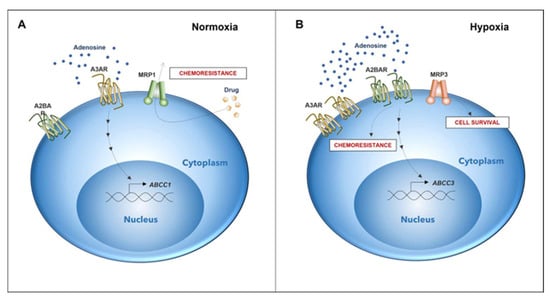 Differential expression of genes associated with chemoresistance in GSCs depends on microenvironmental oxygen levels. (A) Chemoresistance in GSCs under normoxic conditions is elicited by the expression of the A3 adenosine receptor and MRP1 transporter (DOI: https://doi.org/10.3390/10.18632/oncotarget.12033, accessed on 26 May 2022). (B) In GSCs under a hypoxic microenvironment, A2B adenosine receptor expression increases. Activation of A2B triggers the expression of MRP3. Expression and activation of A2B potentially play a role in a novel mechanism of chemoresistance together with MRP3, which could be involved in GSC survival under hypoxia.