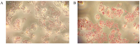 To induce steatosis in the hepatic G2 cellular model and obtain an in vitro model of nonalcoholic fatty liver disease (NAFLD), different methods based on oleic acid were adopted [17,18]. The accumulation of lipids was followed by Oil Red O staining. As shown in, Figure 1 the most effective approach was based on the use of a complex of OA (0.6 mM) and bovine serum albumin (BSA) at a 5:1 ratio (OA:BSA) added to the cellular medium for 24 h. The increasing in TG staining in the steatotic state (Figure 1B) versus control (Figure 1A) demonstrates the accumulation of lipid droplets (red color) and the induction of NAFLD. TG content was also measured using a TG assay kit. To further confirm the induction of steatosis, perilipin-2 (PLIN-2)—a structural component of lipid droplets, involved in the formation and maintenance of lipid storage droplets—was detected by Western blotting and quantified by densitometric analyses (Figure 2A,B). The increase in PLIN-2 in the steatotic model versus the control was 2.4-fold, attesting to the accumulation of lipid droplets and the induction of NAFLD.