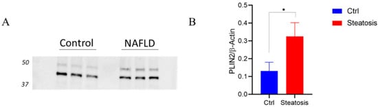 (A) Western blot analyses of perilipin-2 (upper band) in NAFLD versus control. (B) The signals of beta-actin (lower band) were used to normalize the amounts of loaded protein samples in the densitometric analyses. * indicates a p value < 0.05.