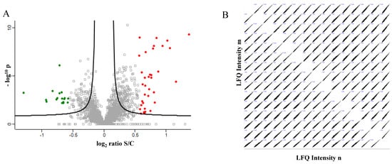 (A) Differentially regulated proteins in NAFLD (S), compared with control (C) resulted from label free analysis. Green represents downregulated proteins (log2 ratio ≤ −0.5). Red represents upregulated proteins (log2 ratio ≥ 0.5). (B) Correlation analyses of the LFQ intensity of 2 biological and 3 technical replicates. Pearson’s correlation coefficient ≥ 0.9.