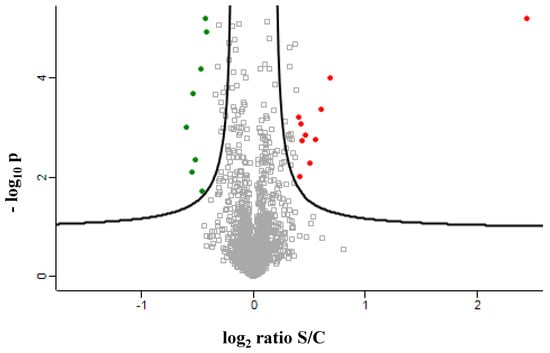 To identify the biological processes, diseases, and functions associated with the differentially expressed proteins in the experimental groups, data were analyzed using the Ingenuity Pathway Analysis software (latest release; QIAGEN, Milan, Italy) based on the Gene Ontology database. The statistical enrichment of the involved pathways was performed using the right-tailed Fisher’s exact test, in correlation with QIAGEN Knowledge Base, assigning a p-value (https://digitalinsights.qiagen.com/products/features/analysis-match/, accessed on 2021). The significance indicates the probability of the association of molecules from the experimental dataset with the pathway by random chance alone. The overall activation/inhibition states of canonical pathways were predicted based on a z-score algorithm. The pathways were colored to indicate their activation z-scores: orange predicts a gain of function, while blue predicts a loss of function.