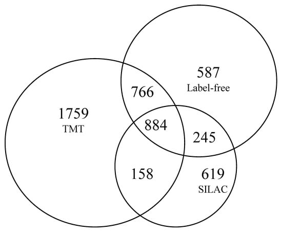 Overall, the three strategies allowed us to deeply explore the proteome; 4086 proteins were quantified, 884 of which were common to all three quantitative proteomic approaches, whereas 1042 proteins were common among the two labelling strategies, i.e., TMT and SILAC. The label-free technique shared 1650 quantified proteins with the TMT experiment and 1129 with the SILAC experiment (Figure 6).