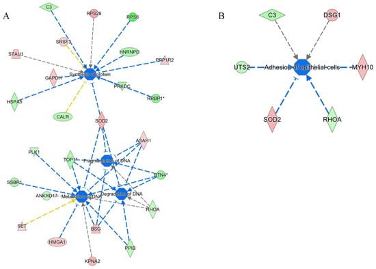 Negatively induced pathways (blue hubs) in NAFLD versus control cells: (A) Synthesis of proteins and DNA metabolism. (B) Adhesion of epithelial cell pathways. The intensity of the color is positively related to the up- (red) or downregulation (green) of genes; orange lines lead to activation, blue lines lead to deactivation, yellow lines represent findings inconsistent with the state of the downstream molecule, and gray lines represent effects that were not predicted. The * indicates the presence of protein isoforms.