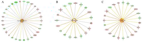 Positively induced pathways (orange hubs) in NAFLD versus control cells: (A) organization of cytoplasm, (B) vasculogenesis, and (C) invasion of cell pathway. The * indicates the presence of protein isoforms.
