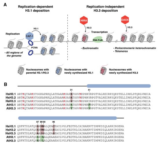The H3.1 variant was first identified in 1977 by Franklin and Zweindler, who used gel electrophoresis to distinguish different histone proteins extracted from mammalian tissues []. Many years after, it was shown that, in multicellular eukaryotes, H3.1 is inserted into chromatin in a replication-dependent manner (Figure 1A) [,]. The specific use of H3.1 during replication has led this histone variant to be named the replication-dependent histone H3 variant. A few years later, it was shown that H3.1 can also be inserted into chromatin in response to UV irradiation at damaged genomic loci in human cells []. The other major H3 protein, the non-centromeric histone H3.3 variant, is inserted into chromatin in a replication-independent manner (Figure 1A) [,]. Comparative analyses suggested that the H3.1 variant evolved from the more ancestral H3.3 []. The differential insertion of H3 variants into chromatin is regulated at the transcriptional level, with the expression of H3.1 peaking specifically during DNA replication, while H3.3 is constitutively expressed throughout the cell cycle [,]. In addition, the deposition of H3.1 and H3.3 onto chromatin is mediated by distinct histone chaperones []. The heterotrimeric CAF-1 complex loads H3.1 at replication forks to maintain nucleosome density genome-wide during replication (Figure 1A) []. CAF-1 can directly interact with the sliding clamp proliferating cell nuclear antigen (PCNA), which contributes to H3.1 incorporation []. In contrast, the H3.3 variant is inserted into chromatin by two other histone chaperones: HIRA and DAXX (Figure 1A) [,,,]. HIRA mediates the replacement of H3.1 with H3.3 during transcription, a process facilitated by the interaction of HIRA with many factors involved in RNA synthesis [,,]. As a result, H3.3 is mostly found in transcriptionally active regions of the genome in proliferative cells []. However, H3.3 is also present in several regulatory regions of the genome [] and genome-wide in post-mitotic cells [,,,] and the chromatin of reproductive cells in Drosophila (Drosophila melanogaster), mouse (Mus musculus), and Arabidopsis (Arabidopsis thaliana) [,,,]. Studies on the histone chaperone DAXX have shown that it deposits H3.3 at the telomeres and specific regions of the pericentromeric heterochromatin in embryonic stem (ES) cells [,]. In proliferative cells, the active replacement of H3.1 with H3.3 at specific loci results in a genome-wide enrichment of the H3.1 variant in heterochromatic, transcriptionally silent regions of the genome [,].