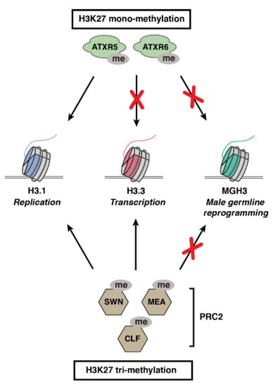 - Jacob, Y.; Feng, S.; LeBlanc, C.A.; Bernatavichute, Y.V.; Stroud, H.; Cokus, S.; Johnson, L.M.; Pellegrini, M.; Jacobsen, S.E.; Michaels, S.D. ATXR5 and ATXR6 are H3K27 monomethyltransferases required for chromatin structure and gene silencing. Nat. Struct. Mol. Biol. 2009, 16, 763–768. [Google Scholar] [CrossRef] [PubMed]