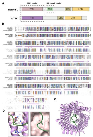 The identification of TSK/TONSL as DNA repair proteins rescuing broken replication forks, the reported interaction between TONSL and histone H3, and the role of ATXR5/6 in maintaining genome stability in plants via H3.1K27me1 during replication all pointed to a possible link between these proteins. The functional relationship between H3.1, ATXR5/6, and TSK/TONSL was confirmed in a recent study that showed that TSK acts as an H3.1 reader protein via a conserved tetratricopeptide repeat (TPR) domain []. The TPR domain in TSK is composed of 11 repeated TPR motifs (hairpins of antiparallel α-helices) that fold into a channel-like solenoid (Figure 3B) []. The N-terminal tail of the H3.1 variant (amino acids 1–40) fits in this domain by folding back inside the structure (Figure 3C). A small binding pocket, strictly conserved across plant TSK orthologs, selectively reads the unique residue A31 of H3.1 []. Importantly, the TPR domain of mammalian TONSL also displays a preference for binding the H3.1 variant over H3.3 in vitro []. The AlphaFold model for the TPR domain of TONSL predicts a similar organization of the α-helices forming the interacting pocket with H3.1A31 compared with plants [] (Figure 3D). Interestingly, there are variations in some of the main residues contributing to reading A31 between plants and animals (Figure 3B,D). This observation may reflect the need to differentiate against H3.3S31 in animals, as this residue is replaced with T31 in plant H3.3 (Figure 1B). Additional structural studies are needed to fully understand the similarities and differences in the way plant TSK and animal TONSL selectively interacts with H3.1.