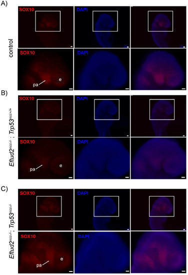 Eftud2ncc−/− mutants as they exit the neural tube leads to the abnormal expression of proteins such as SOX10, important for their survival and patterning in the pharyngeal arches. Since removing P53 increases expression of SOX10 in