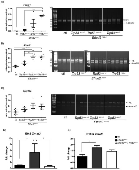 Eftud2ncc−/− embryos, prior to the onset of malformations, revealed increased skipping of exon 3 of