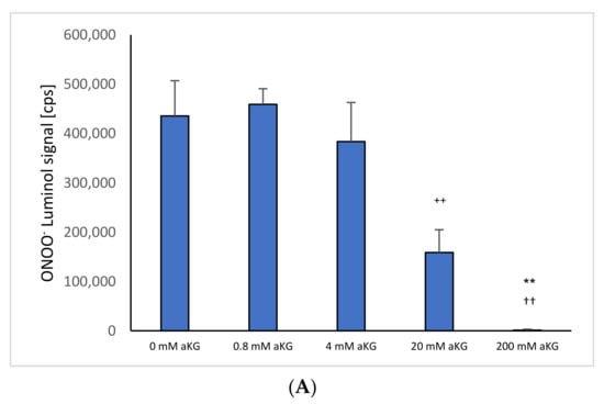 Figure 1A shows ONOO− luminol-induced chemiluminescence levels after 1 s in the presence or absence of different concentrations of αKG (n = 5). Using 4 mM αKG (383,632 ± 79,292 cps), a significant reduction in ONOO− was obtained compared to the control signal in the absence of any antioxidant (435,557 ± 71,480 cps; p < 0.01). Increasing the concentration to 20 mM αKG showed a more than two-thirds reduction (158,688 ± 46,197 cps; p < 0.01). Usage of 200 mM αKG reduced the signal completely (1267 ± 1929 cps; p < 0.01).