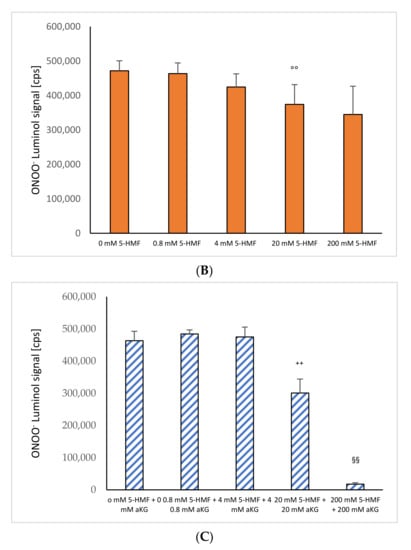 ONOO− induced luminol measurements after 1 s in the absence or presence of (A) 0–200 mM aKG (n = 5); (B) 0–200 mM 5-HMF (n = 5); (C) aKG (0–200 mM) + 5-HMF (0–200 mM; n = 5). ** p < 0.01: significance between 20 and 200 mM aKG compared to 4 mM aKG; †† p < 0.01: significance between 20 and 200 mM aKG; °° p < 0.01: significance between 0 mM 5-HMF and 20 and 200 mM 5-HMF; ++ p < 0.01: significance between 4 mM of combined aKG + 5-HMF and 20 mM of combined aKG + 5-HMF. §§ p < 0.01: significance between 200 mM combined aKG + 5-HMF and 20 mM combined aKG + 5-HMF.