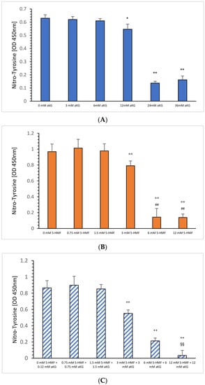 Figure 2B shows the absorbance signals of nitro-tyrosine in the absence or presence of 5-HMF. Using 3 mM 5-HMF, the nitro-tyrosine level decreased significantly down to 82% compared to 0.75 mM 5-HMF (0.791 ± 0.11 vs. 1.014 +/− 0.06; p < 0.01); 6 mM 5-HMF down to 15% (0.143 ± 0.035, p < 0.01) and 12 mM 5-HMF to 14% (0.139 ± 0.043; p < 0.01) as shown in Figure 2B. Both, 6 mM and 12 mM also showed a significant reduction compared to 1.5 mM 5-HMF (p < 0.01).