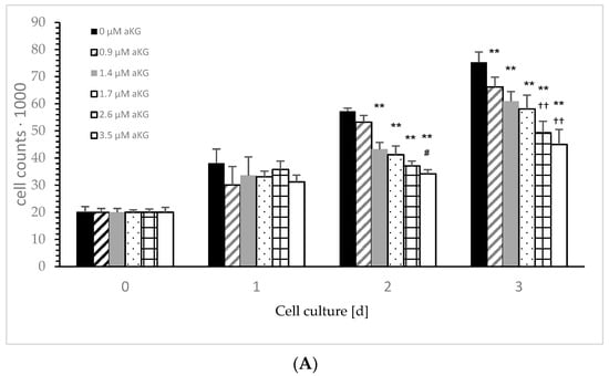 Figure 3A describes the cell growth with different concentrations of aKG in Jurkat cells over 3 days. After 24 h, no influence effecting on the cell growth, positively or negatively, was obtained using several concentrations (i.e., 0.9, 1.4, 1.7, 2.6 and 3.5 µM) of aKG. The cell growth after 48 h was significantly reduced compared to the control (57,123 ± 2122 cells, n = 5) by several concentrations of aKG: 1.4 µM aKG (53,644 ± 3234 cells; p < 0.01; n = 5), 1.7 µM aKG (43,145 ± 2550 cells; p < 0.01; n = 5), 2.6 µM aKG (41,233 ± 1811 cells; p < 0.01; n = 5), and 3.5 µM (34,246 +/− 1879 cells; p < 0.01; n = 5). The latter one showed nearly a 40% reduction and obtained a significant reduction compared to the usage of 2.6 µM aKG (p < 0.05; n = 5). After 72 h of incubation, all used aKG concentrations significantly decreased the growth of Jurkat cells; a 40% reduction was obtained using 3.5 µM aKG (45,023 ± 5497 cells; p < 0.01; n = 5), followed by 35% with 2.6 µM (49,323 ± 4237 cells; p < 0.01; n = 5), 23% with 1.7 µM aKG (58,098 ± 5127 cells; p < 0.01; n = 5), 19% with 1.4 µM (60,923 ± 3577 cells; p < 0.01; n = 5) and 12% using 0.9 µM aKG (66,256 ± 4239 cells; p < 0.01; n = 5) compared to the growth of control cells (75,346 ± 3786 cells; n = 5). While in the absence of aKG, cell growth increased 2.9 fold after 48 h and 3.8 fold after 72 h, the highest concentrations of aKG, 2.6 and 3.5 µM, depleted the cell growth compared to the control: 35% and 41% reductions were observed after 48 h, and 34% and 37% reductions were observed after 72 h of incubation.