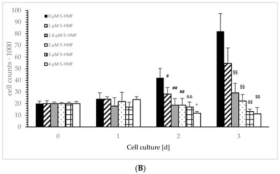 Cell proliferation experiments were performed using different aKG (0–3.5 µM), 5-HMF (0–4 µM) or aKG + 5-HMF concentrations (0, 1.7 µM aKG + 0.7 µM 5-HMF and 3.5 µM aKG + 1.7 µM 5-HMF) in medium for 24, 48 and 72 h with the cells as described earlier []. Cell growth was estimated with the CASY® Cell Counter (Hoffmann-La Roche Ltd., Basel, Switzerland). Aliquots were used for further experiments.
