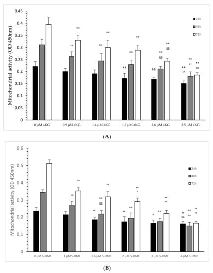 Mitochondrial activity of the Jurkat cell line in the absence or presence of different concentrations of aKG (A) or 5-HMF (B) estimated in absorbance after 24, 48 and 72 h of cultivation (n = 5). (A) On 24 h incubation: ** p < 0.01: significance between 0 µM aKG and 0.9, 1.4, 1.7, 2.6 and 3.5 µM aKG; $$ p < 0.01: significance between 2.6 and 1.7 µM aKG; ## p < 0.01: significance between 2.6 and 1.7 µM aKG; 48 h incubation: °° p < 0.01: significance between 0 µM aKG and 0.9, 1.4, 1.7, 2.6 and 3.5 µM aKG; §§ p < 0.01: significance between 0.9 and 2.6 µM aKG; †† p < 0.01: significance between 1.7 and 3.5 µM aKG; 72 h incubation: && p < 0.01: significance between 0 µM aKG and 1.7, 2.6 and 3.5 µM aKG; ^^ p < 0.01: significance between 1.4 and 3.5 µM aKG. (B) On 24 h incubation: ## p < 0.01: significance between 0 µM 5-HMF and 1 and 2 µM 5-HMF; # p < 0.05: significance between 1 and 3 µM 5-HMF; && p < 0.01: significance between 1 and 4 µM 5-HMF. On 48 h incubation: °° p < 0.01: significance between 0 µM 5-HMF and 1, 1.6, 2, 3 and 4 µM 5-HMF; $$ p < 0.01: significance between 1 µg/mL 5-HMF and 1.6, 2 and 3 µM 5-HMF; ^^ p < 0.01: significance between 2 µg/mL and 4 µM 5-HMF. On 72 h incubation: ** p < 0.01: significance between 0 µM 5-HMF and 1, 1.6, 2, 3 and 4 µM 5-HMF; + p < 0.05: significance between 1 and 2 µM 5-HMF; ++ p < 0.01: significance between 2 and 3 µM 5-HMF; †† p < 0.01: significance between 3 and 4 µM 5-HMF.