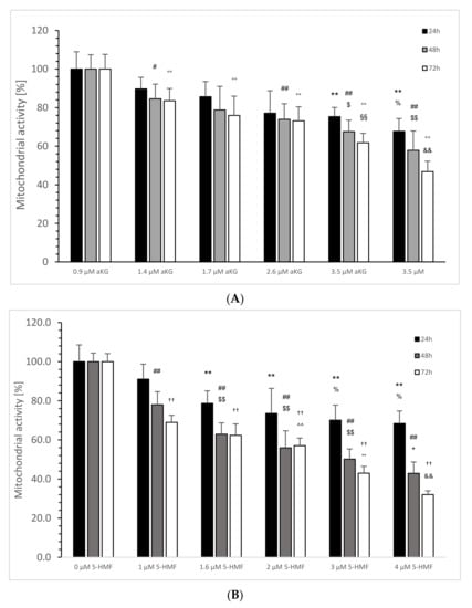 Calculated mitochondrial activity in percentage of the Jurkat cell line in the absence or presence of 0, 0.9, 1.4, 1.7, 2.6 and 3.5 µM aKG (A) or 0, 1, 1.6, 2, 3 and 4 µM 5-HMF (B) after 24, 48 and 72 h of cultivation (n = 5). (A) On 24 h incubation: ** p < 0.01: significance between 0 µM aKG and 2.6 and 3.5 µM aKG; % p < 0.05: significance between 2.6 and 3.5 µM; # p < 0.05: significance between 0 and 1.7 µM aKG; 48 h incubation: ## p < 0.01: significance between 0 µM aKG and 2.6 and 3.5 µM aKG; $ p < 0.01: significance between 0.9 and 2.6 µM aKG; $$ p < 0.01: significance between 0.9 and 3.5 µM aKG; 72 h incubation °° p < 0.01: significance between 0 µM aKG and 0.9, 1.4, 1.7, 2.6 and 3.5 µM aKG; §§ p < 0.01: significance between 0.9 and 2.6 µM aKG; && p < 0.01: significance between 2.6 and 3.5 µM aKG; (B) 24 h incubation: ** p < 0.01: significance between 0 µM 5-HMF and 1, 1.6, 2, 3 and 4 µM 5-HMF; % p < 0.05: significance between 1 µM 5-HMF and 3 and 4 µM 5-HMF; 48 h incubation: ## p < 0.01: significance between 0 µM 5-HMF and 1, 1.6, 2, 3 and 4 µM 5-HMF; §§ p < 0.01: significance between 1 µM 5-HMF and 1.6, 2 and 3 µM 5-HMF; + p < 0.05: significance between 2 and 4 µM 5-HMF; 72 h incubation: †† p < 0.01: significance between 0 µM 5-HMF and 1, 1.6, 2, 3 and 4 µM 5-HMF; ^^ p < 0.01: significance between 1 and 2 µM 5-HMF; °° p < 0.01: significance between 2 and 3 µM 5-HMF; && p < 0.01: significance between 3 and 4 µM 5-HMF.