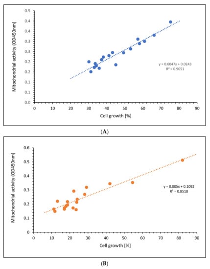 Comparing the mitochondrial activity with the cell growth of the Jurkat cells, Figure 6A shows a high linear relation (r2 = 0.9051) of all aKG concentrations at different incubation times, nearly the same for 5-HMF (r2 = 0.8518) as presented in Figure 6B. The slope in the linear function using aKG was even higher (k = 0.0047) compared to 5-HMF (k = 0.005). The 5-HMF clouds are shown more in the lower scales between 10 and 30 percent of cell growth, whereas aKG was randomly distributed between 30 and 70% of cell growth.