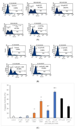 Caspase-3-activated apoptosis was carried out as described in a recently published paper []. After incubation for 72 h in the absence or in the presence of 1.7 or 3.5 µM of aKG, 2 or 4 µM 5-HMF, 1.7 µg/mL aKG + 0.7 µM 5-HMF and 3.5 µM aKG + 1.3 µM 5-HMF, cells were separated by centrifugation at 3500× g. After several washing steps using cold PBS, 500 µL Cytofix–Cytoperm was added to the cells on ice at −20 °C. Antibody–FITC was used after incubation and the washing step was examination of the caspase-3 activity at 495/519 nm, respectively.