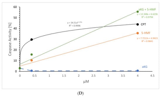 Figure 7D shows the concentration-dependent caspase-activated apoptosis of aKG, 5-HMF and of the combined solution aKG + 5-HMF after 72 h of incubation. As the positive control CPT showed a logarithmic correlation perfectly with r2 = 1, saturation was reached using 4 µM. The usage of aKG showed no correlation, because no caspase-activated apoptosis was obtained. 5-HMF showed a linear correlation with a correlation coefficient of approximately r2 = 0.98. No saturation was obtained using 4 µM, and the caspase-activated apoptosis using 4 µM 5-HMF was only approximately 10% lower than the highest positive CPT signal. The combination solution (i.e., aKG + 5-HMF) showed also a linear function with a regression term of r2 = 0.98. The slope was higher compared to the 5-HMF alone. The signal using 3.5 µM aKG + 1.3 µM 5-HMF was 20% higher compared to 4 µM 5-HMF, the usage of 1.7 µM aKG + 0.7 µM 5-HMF was 5% higher than 2 µM 5-HMF. No saturation was obtained using 3.5 µM aKG + 1.3 µM 5-HMF compared to CPT.