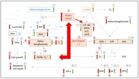 1: Addition of alpha-ketoglutarate interferes with peroxides such as peroxynitrite; (2) recycling NO and accumulation of succinate; (3) succinate effects positively on HIFα, low cell growth, higher apoptosis and cell death; (4) reduction in RONS, such as ONOO- or O2•−, implicate no modified proteins, amino acids, such as the p53 and p21 pathways, or SOD, CAT, GPx, NOS and HIFα, but also carbohydrates, nucleic acids and fatty acids and implicate again step 3.