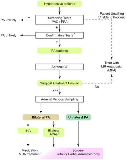 - Funder, J.W.; Carey, R.M.; Mantero, F.; Murad, M.H.; Reincke, M.; Shibata, H.; Stowasser, M.; Young, W.F. The Management of Primary Aldosteronism: Case Detection, Diagnosis, and Treatment: An Endocrine Society Clinical Practice Guideline. J. Clin. Endocrinol. Metab. 2016, 101, 1889–1916. [Google Scholar] [CrossRef] [PubMed]