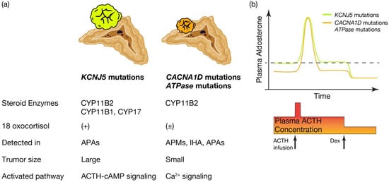 - Kitamoto, T.; Suematsu, S.; Yamazaki, Y.; Nakamura, Y.; Sasano, H.; Matsuzawa, Y.; Saito, J.; Omura, M.; Nishikawa, T. Clinical and Steroidogenic Characteristics of Aldosterone-Producing Adenomas With ATPase or CACNA1D Gene Mutations. J. Clin. Endocrinol. Metab. 2016, 101, 494–503. [Google Scholar] [CrossRef]