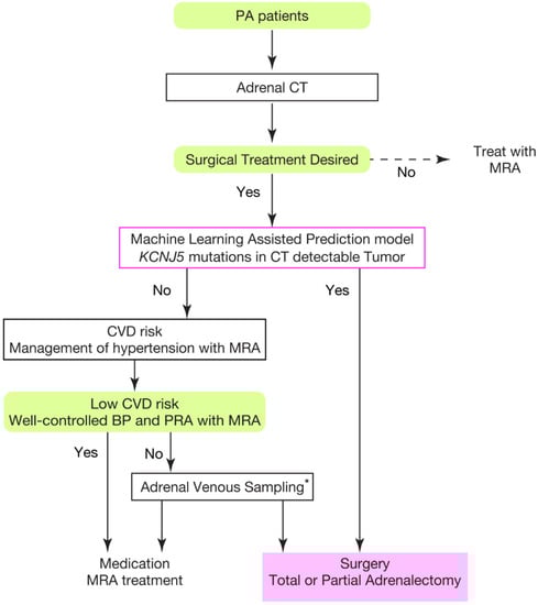 - Kitamoto, T.; Omura, M.; Suematsu, S.; Saito, J.; Nishikawa, T. KCNJ5 mutation as a predictor for resolution of hypertension after surgical treatment of aldosterone-producing adenoma. J. Hypertens. 2018, 36, 619–627. [Google Scholar] [CrossRef]