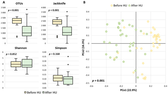 The alpha and beta diversity profiles before and after HU treatment were quite distinct. The number of observed OTUs and indexes for species richness (Ace, Chao1, Jackknife) indicated statistical differences with the Wilcoxon test (p < 0.001), suggesting a higher diversity before the initiation of hydroxyurea (Figure 1A). As for the estimates of species evenness (Shannon and Simpson indexes), no significant differences were observed between the two groups.