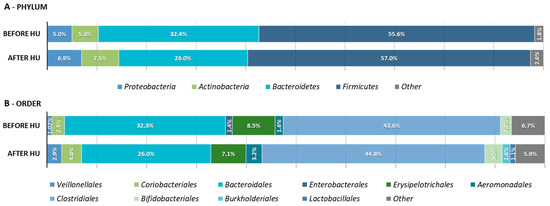 One of the few bacteria more prevalent in the group before HU was an unclassified Clostridium_g24, a group that includes C. aldenense, C. asparagiforme, C. lavalense, C. clostridioforme, C. citroniae, and C. bolteae. The last one, C. bolteae, is commonly present in stools of children, but its overabundance can be responsible for chronic diarrheal episodes [36]. Moreover, both C. bolteae and C. clostridioforme are considered opportunistic pathogens, which have been isolated from intra-abdominal infections, bacteremia, and even abscesses [36].