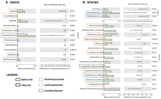 Distribution of the mean proportions of bacterial abundances between SCA children before (n = 33) and after (n = 33) HU treatment, regarding the taxonomic rank of (A) genus and (B) species. Besides the patient’s group, the legend indicates three relevant taxonomic families: Ruminococcaceae, Lachnospiraceae, and Lactobacillaceae. The results were filtered using a p-value lower than 0.05 with Welch’s t-test, the effect size of 0.05 threshold, and retaining unclassified reads in STAMP software.