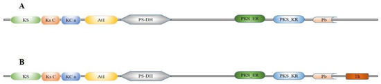 Domain schematic of SlFAS1 (A) and SlFAS2 (B) in S. litura. KS, Ketoacyl-synt (pfam00109); Ks C, Ketoacyl-synt_C (pfam02801); KC a, KAsynt_C_assoc (pfam16197); At1, Acyl_transf_1 (pfam00698); PS-DH (PF14765); PKS_ER (smart00829); PKS_KR (smart00822); Pb, PP-binding (pfam00550); Th, Thioesterase (pfam00975).