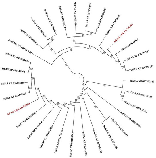 The sequences of FASs were identified from the previously constructed S. litura transcriptome database (BioProject Acc. in NCBI: PRJNA810583). An open reading frame (ORF) finder (https://www.ncbi.nlm.nih.gov/orffinder/) (accessed on 21 February 2021) was used to predict the ORFs of putative SlFAS1 and SlFAS2 genes. The NCBI Conserved Domain Search website (https://www.ncbi.nlm.nih.gov/Structure/cdd/wrpsb.cgi) (accessed on 21 February 2021) was used to predict the protein functional domains. The Simple Modular Architecture Research Tool (SMART) online software (Version: 3.3.2, EMBL, Heidelberg, Germany) (http://smart.embl-heidelberg.de/) (accessed on 21 February 2021) was used to predict the conserved motifs. DNAMAN 8.0 (Lynnon Corporation, Quebec City, QC, Canada) was used for multiple alignments of various protein sequences. Phylogenetic analysis was conducted using the neighbour-joining method by Molecular Evolutionary Genetic Analysis 6.0 (MEGA 6.0, Mega Limited, Auckland, New Zealand) software with 1000 bootstrap replications. The Interactive Tree Of Life (iTOL) online tool (https://itol.embl.de) (accessed on 21 February 2021) was used to generate the circular phylogenetic tree. SlFASs homologous amino acid sequences of Homo sapiens, Spodoptera litura, Bombyx mori, Drosophila melanogaster, Spodoptera frugiperda, Helicoverpa zea, Trichoplusia ni, Ostrinia furnacalis, Helicoverpa armigera, Plutella xylostella, Agrotis ipsilon were downloaded from GenBank (http://www.ncbi.nlm.nih.gov/) (accessed on 21 February 2021).