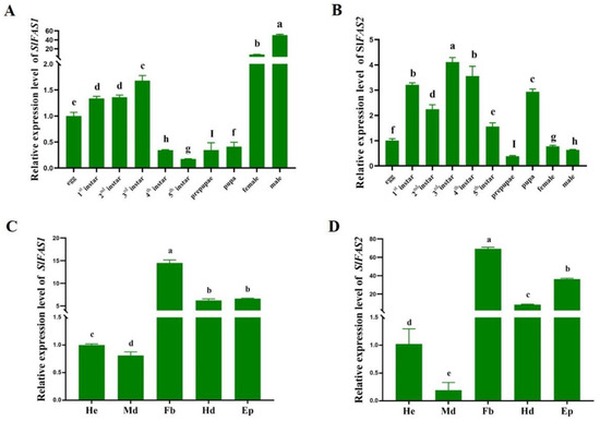 Expression of SlFAS1 and SlFAS2 in different development stages and tissues. (A) Expression patterns of SlFAS1 in different development stages. (B) Expression patterns of SlFAS2 in different development stages. (C) Expression patterns of SlFAS1 in different tissues. (D) Expression patterns of SlFAS2 in different tissues. He, haemolymph; Md, midgut; Fb, fat body; Hd, head; Ep, epidermis. Significant differences in expression levels among developmental stages and different tissues were compared using a one-way analysis of variance (ANOVA) with Tukey’s post-hoc test. Different lowercase letters above the bars indicate significant differences (p < 0.05).