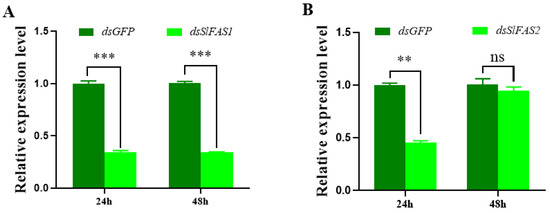 Expression levels of SlFAS1 and SlFAS2 after RNAi. (A) SlFAS1 expression levels after dsSlFAS1 injection. (B) SlFAS2 expression levels after dsSlFAS2 injection. Significant differences in the expression levels of each target gene were compared using a one-way analysis of variance (ANOVA) followed by Tukey’s post-hoc test. Significant differences are indicated by asterisks (** p < 0.01; *** p < 0.001; ns: no significant differences).