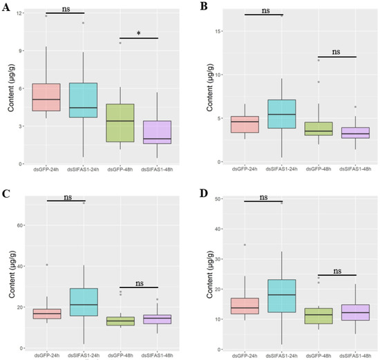 Effect of silencing SlFAS1 on the fatty acid content in S. litura larvae. (A) Effect of silencing SlFAS1 on methyl α-linolenate content. (B) Effect of silencing SlFAS1 on methyl palmitate content. (C) Effect of silencing SlFAS1 on methyl oleate content. (D) Effect of silencing SlFAS1 on methyl linoleate content. Significant differences are indicated by asterisks (* p < 0.01; ns: no significant differences; non parametric Mann–Whitney test).