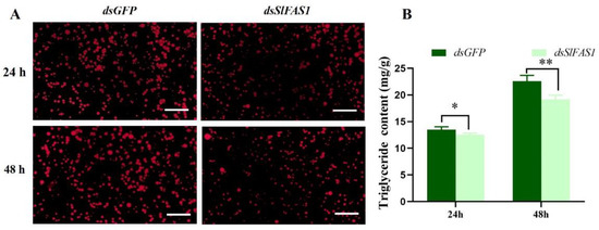 Lipid accumulation in the fat bodies of S. litura larvae after dsSlFAS1. (A) The fat body of S. litura was stained with Nile red 24 and 48 h after dsSlFAS1 injection and examined by laser scanning microscope. Scale bar, 20 µm. (B) Triglyceride content in the fat body of S. litura after dsSlFAS1 injection. Differences in the Triglyceride content was compared using a one-way analysis of variance (ANOVA) followed by Tukey’s post-hoc test. Significant differences were indicated by asterisks (* p < 0.05; ** p < 0.01).