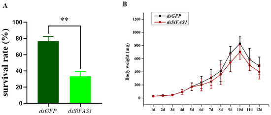 Effect of SlFAS1 on the development of S. litura larvae. (A) Survival rate of S. litura larvae after injection of dsSlFAS1 into third instar larvae. (B) Growth trajectory of S. litura larvae after injection of dsSlFAS1 into the third instar larvae. Significant differences were compared using a one-way analysis of variance (ANOVA). Significant differences were indicated by asterisks (** p < 0.01).
