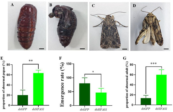 Morphology of pupae and adults after knocking down SlFAS1 in fifth instar S. litura. (A) Normal pupae after dsGFP injection. (B) Abnormal pupae after dsSlFAS1 injection. (C) Normal adults after dsGFP injection. (D) Abnormal adults after dsSlFAS1 injection. (E) Effect of silencing SlFAS1 on the proportion of abnormal pupae in S. litura. (F) Effect of silencing SlFAS1 on emergence rate in S. litura. (G) Effect of silencing SlFAS1 on the proportion of abnormal adults in S. litura. Significant differences were compared using a one-way analysis of variance (ANOVA). Significant differences were indicated by asterisks (* p < 0.05; ** p < 0.01; *** p < 0.001); scale bars in A and B: 2 mm; scale bars in C and D: 2 mm.