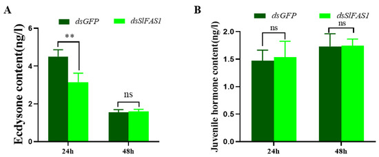 Effect of knocking down SlFAS1 on the content of juvenile hormone and ecdysone in the haemolymph of fifth instar larvae. (A) Effect of silencing SlFAS1 on ecdysone content in the haemolymph of fifth S. litura larvae. (B) Effect of silencing SlFAS1 on juvenile hormone content in the haemolymph of fifth instar S. litura larvae. Significant differences were compared using a one-way analysis of variance (ANOVA). Significant differences were indicated by asterisks (** p < 0.01; ns, no significant differences).