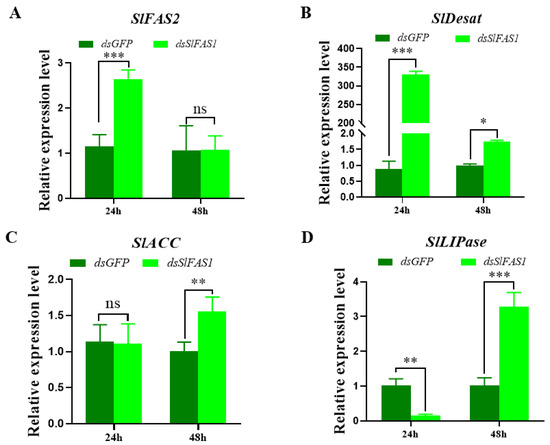To explore the effect of silencing SlFAS1 on the lipogenesis pathway, the expression levels of other key genes in the fatty acid synthesis pathway after dsSlFAS1 injection were validated by qRT-PCR. The expression levels of SlFAS2 and SlDesat were significantly upregulated24 h after dsSlFAS1 injection, and the expression of SlDesat was also increased 48 h after dsSlFAS1 injection. The expression levels of SlACC and SlLIPase were significantly upregulated 48 h after dsSlFAS1 injection; in addition, SlLIPase was significantly downregulated 24 h after silencing SlFAS1 (Figure 10).