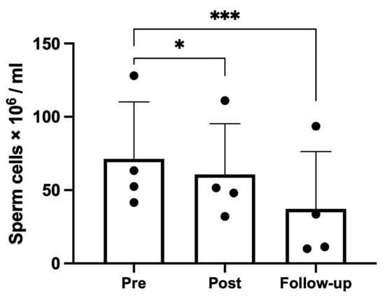 Sperm count results; one participant was removed from the analysis due to too low values; changes over time were significant at * p < 0.05; *** p < 0.001.